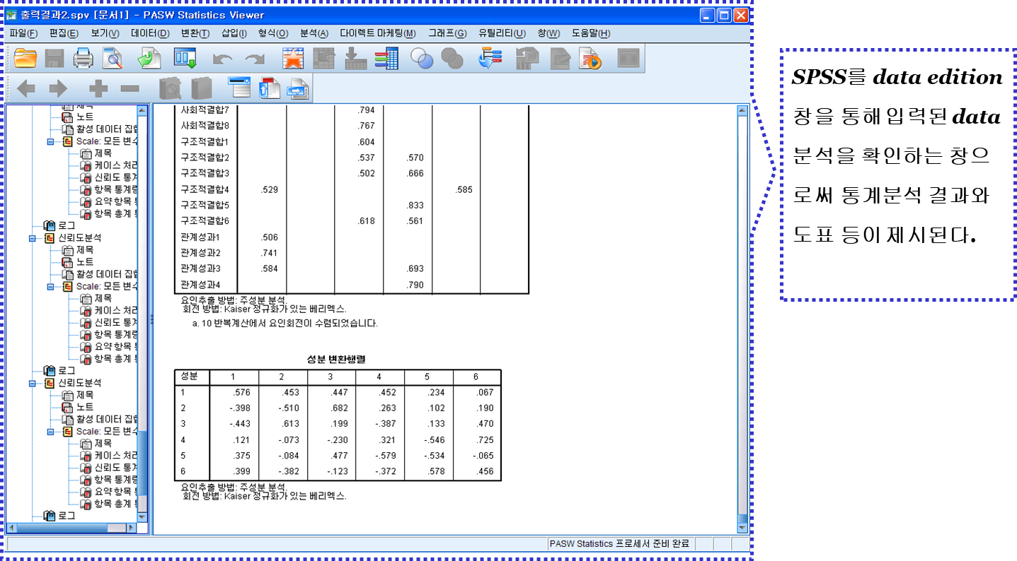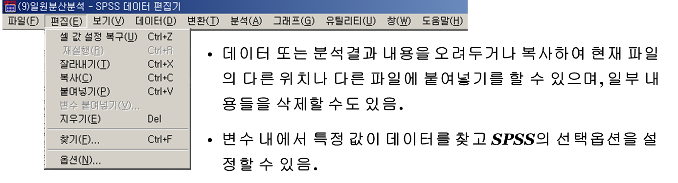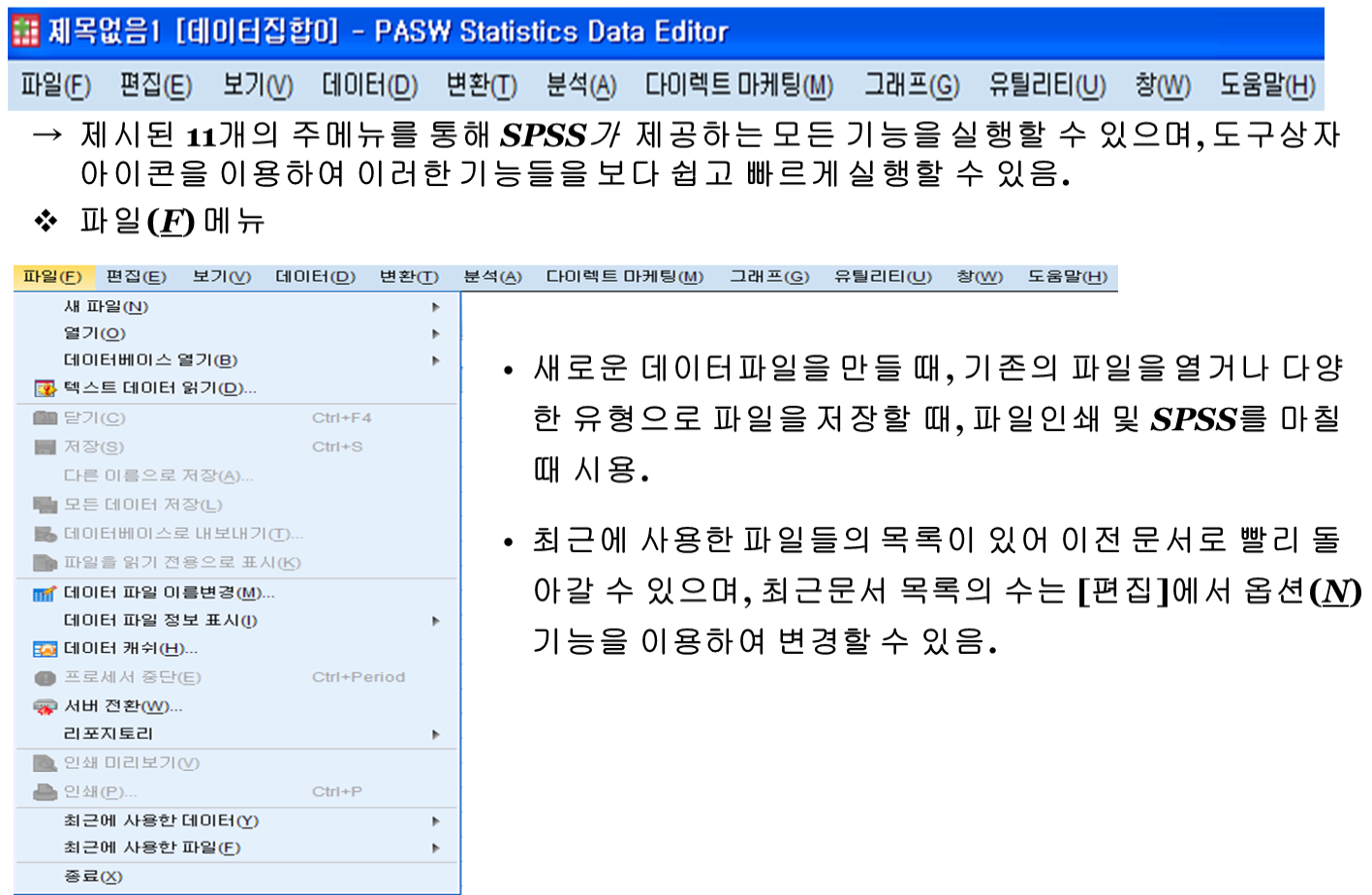 [ SPSS 의 주메뉴, 도구모음 및 상태표시줄 ]